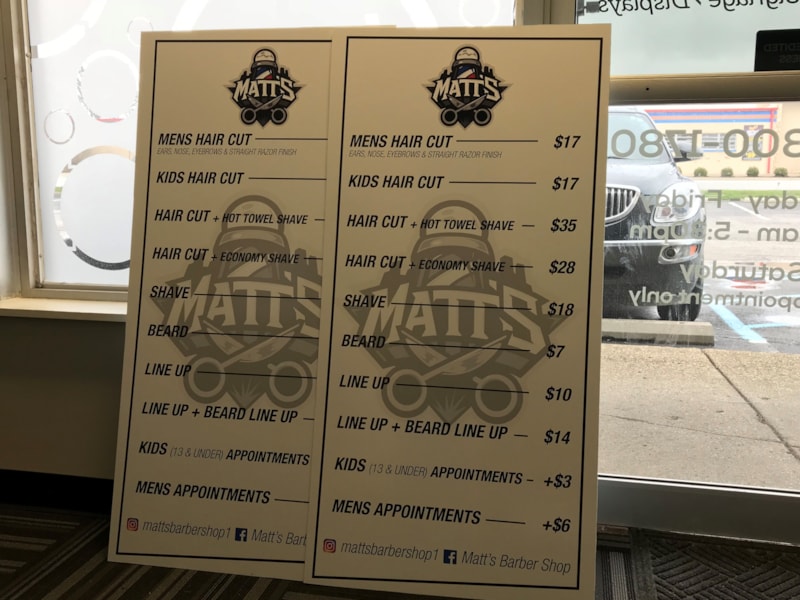 Matts Barber Shop Price List Board in Greenwood,IN