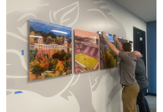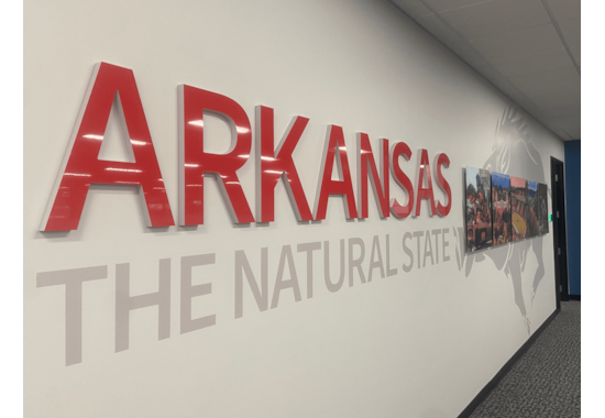 Arkansas Themed Wall Graphic Representing Pace’s Origin State with Landscape Second Surface Acrylic Prints, Dimensional Custom Painted Lettering and Vinyl