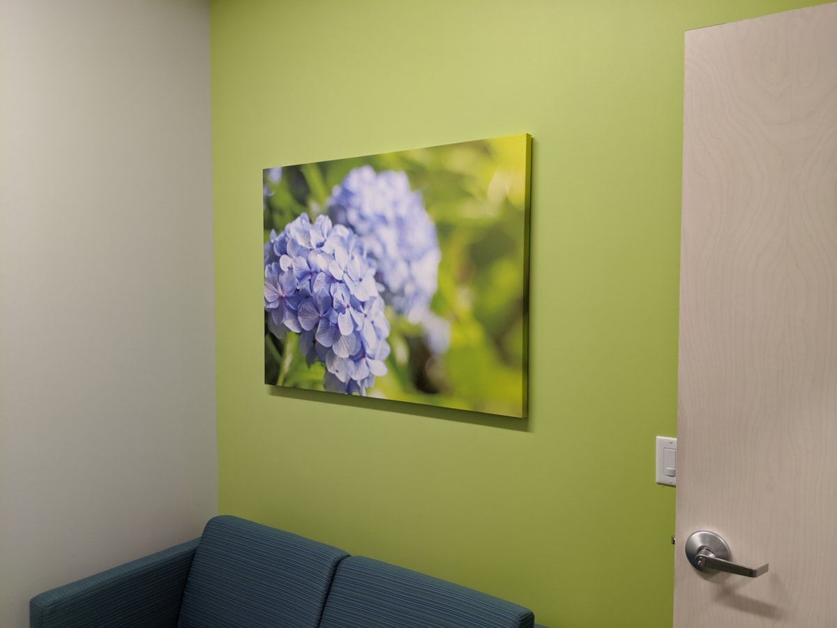 Canvas prints are best used indoors in places where they’ll be consistently seen by both your staff and guests. Your lobby, reception area, waiting room, conference room or hallways are all great applications for canvas prints.